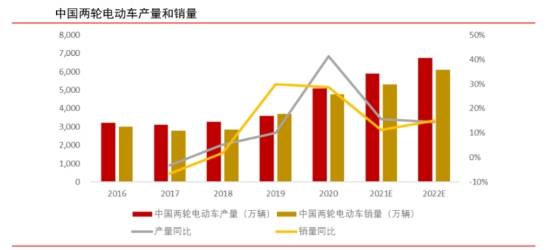 根據(jù)艾瑞咨詢發(fā)布的《2021 年中國(guó)兩輪電動(dòng)車智能化白皮書》,2016-2020年,我國(guó)兩輪電動(dòng)車產(chǎn)量從 3,215萬輛增加至5,100萬輛;同期,我國(guó)兩輪電動(dòng)車銷量從3,000萬輛增加至4,760萬輛,CAGR 為 12.23%。其中,2020年我國(guó)兩輪電動(dòng)車產(chǎn)量同比增速高達(dá)41.3%,我國(guó)兩輪電動(dòng)車銷量同比增速為28.6%,主要系因?yàn)閲?guó)內(nèi)各地新國(guó)標(biāo)過渡期限臨近,兩輪電動(dòng)車市場(chǎng)上超標(biāo)兩輪車的更新替換需求高漲。中期來看,我國(guó)兩輪電動(dòng)車未來將保持穩(wěn)定增長(zhǎng)。一方面,2021 年起,超標(biāo)兩輪電動(dòng)車將正式迎來大量清退替換,替換需求將繼續(xù)推高中國(guó)兩輪電動(dòng)車的產(chǎn)銷量;另一方面,隨著共享電動(dòng)自行車運(yùn)營(yíng)規(guī)范化程度提升,哈羅、美團(tuán)等平臺(tái)有望加大共享電動(dòng)自行車的投放量。艾瑞咨詢預(yù)計(jì),2022年我國(guó)兩輪電動(dòng)車銷量將達(dá)到 6,100 萬輛。